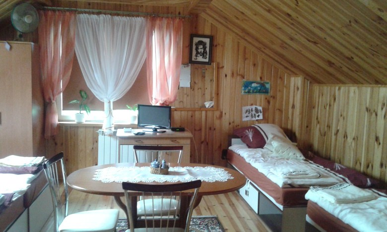 Noclegi: 3 pokoje dwuosobowe + łazienka na poddaszu, w pełni wyposażoną kuchnię.